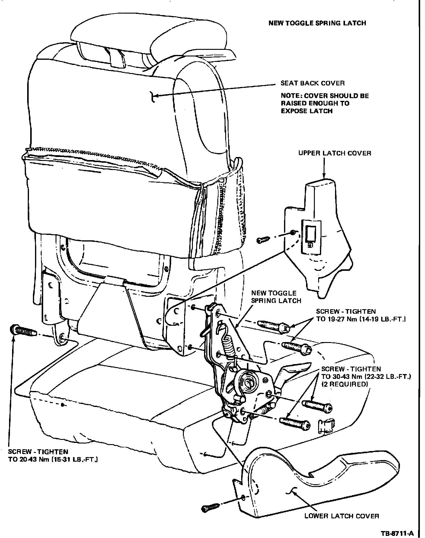 8. Attach the new toggle spring latch to the seat back frame and tighten screws to 19-27 N-m (14-19 ft.lbs.).