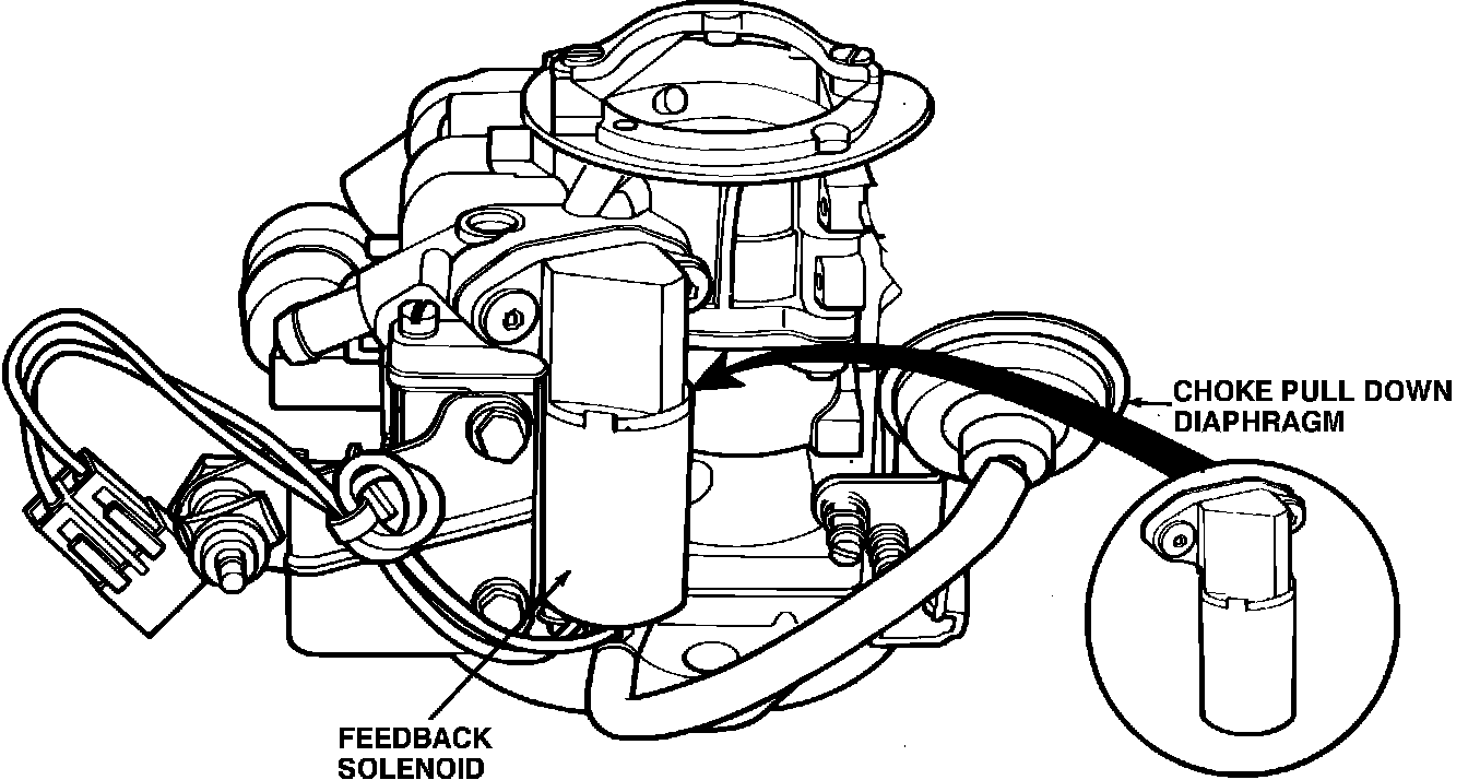 This solenoid assembly, Fig. 2, is an integral part of the carburetor. The feedback solenoid operates as a pulse width modulated (dithering) solenoid, varying the air bled into the idle and main metering circuits. In response to commands from the MCU or EEC system, the solenoid will vary the air/fuel ratio delivered into the engine.