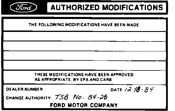 Obtain an Authorized Modifications decal and list the date, dealer number and summary of alterations performed. Select a prominent place adjacent to the Vehicle Emission Control Information decal suitable for installing the Authorized Modifications decal. Clean the area, install the decal and cover it with a clear plastic decal shield.