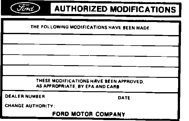Obtain an Authorized Modifications decal and list the date, dealer number and summary of alterations performed. Select a prominent place adjacent to the Vehicle Emission Control Information decal suitable for installing the Authorized Modifications decal. Clean the area, install the decal and cover it with a clear plastic decal shield.