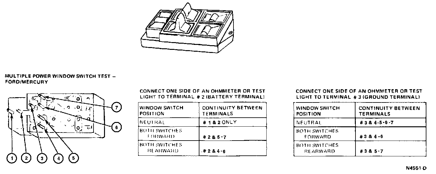 Testing the power window master switch should be performed with the switch removed from the vehicle. Use a self-powered test lamp or an ohmmeter such as Rotunda Digital Volt Ohm Meter 007-00001 or equivalent.