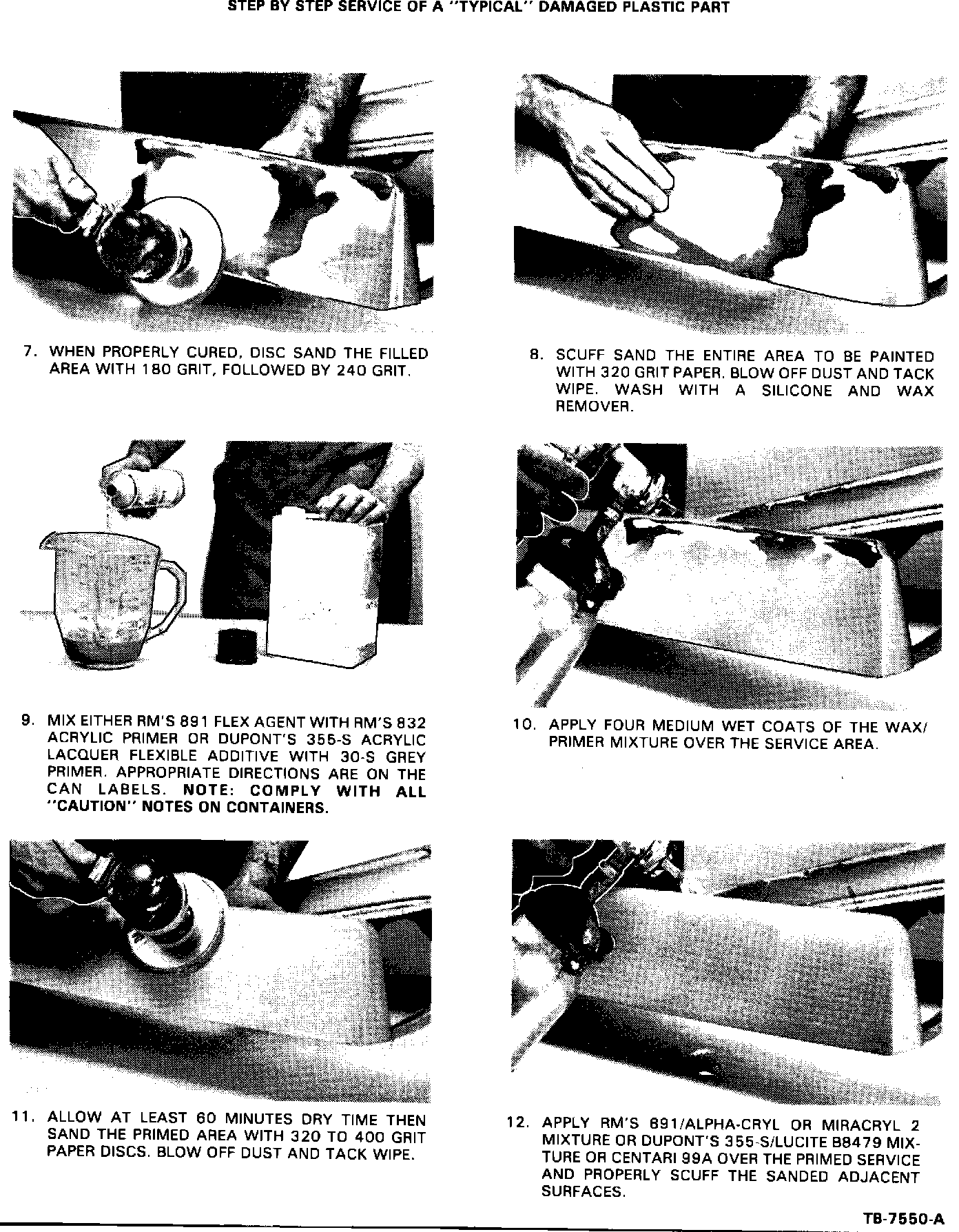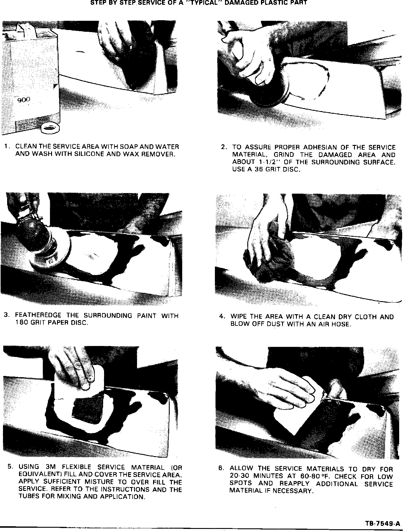 The recommended cosmetic service for thermoplastic bumper is similar to plastic body part service recommended for "soft facias" or "bumper covers". Essentially, the procedure consists of grinding around the damaged area (about 1-1/2" to expose the substrate for maximum adhesion), feather edging the paint around the prepared area, applying the adhesive service material (3M part no. 05900), restoring the surface contour, and painting.