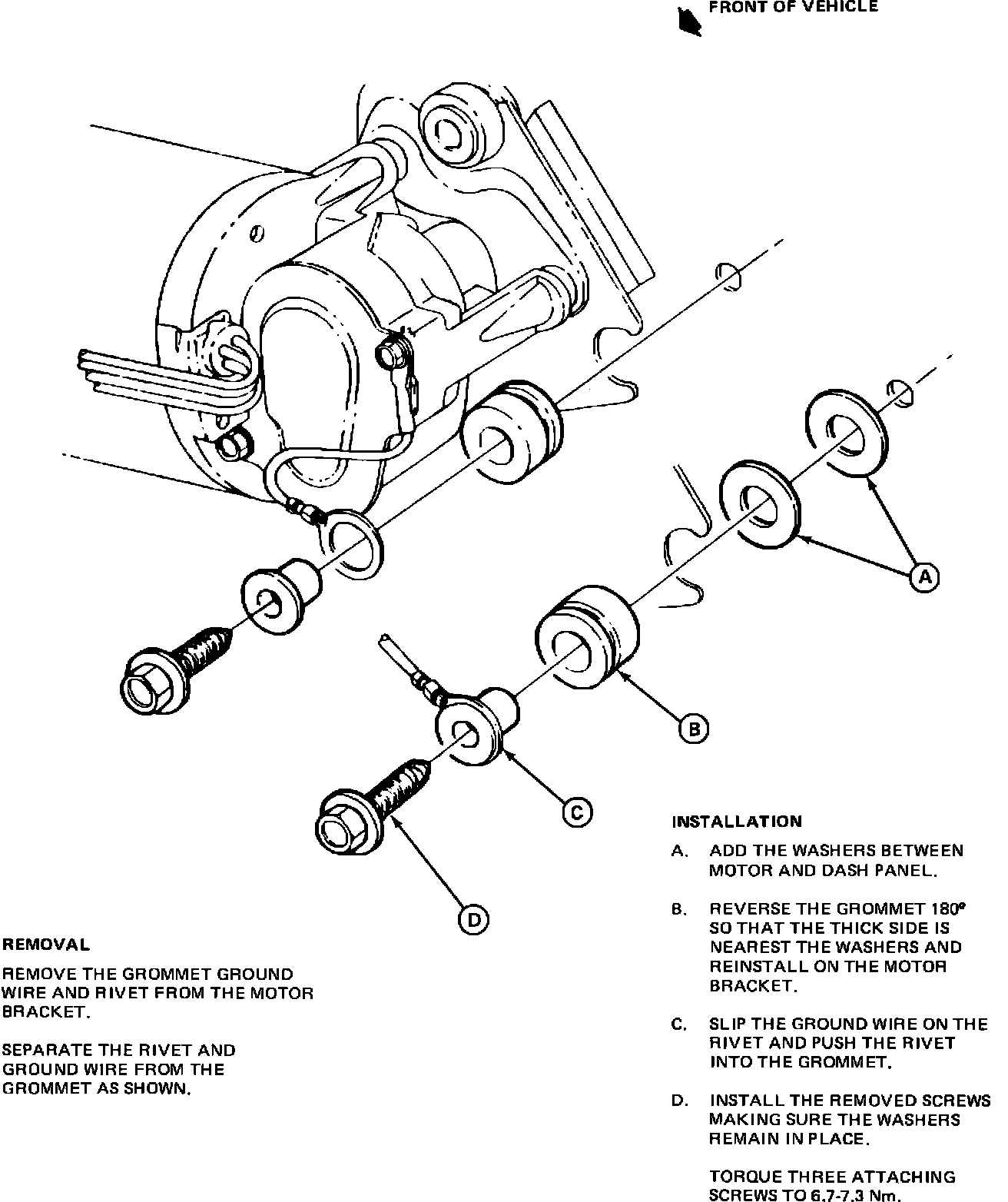A left hand wiper blade chatter or contact with the "A" pillar condition can be serviced by rotating one of the wiper motor rubber grommets 180~ and shimming with two washers. Refer to Figure 22 for details.