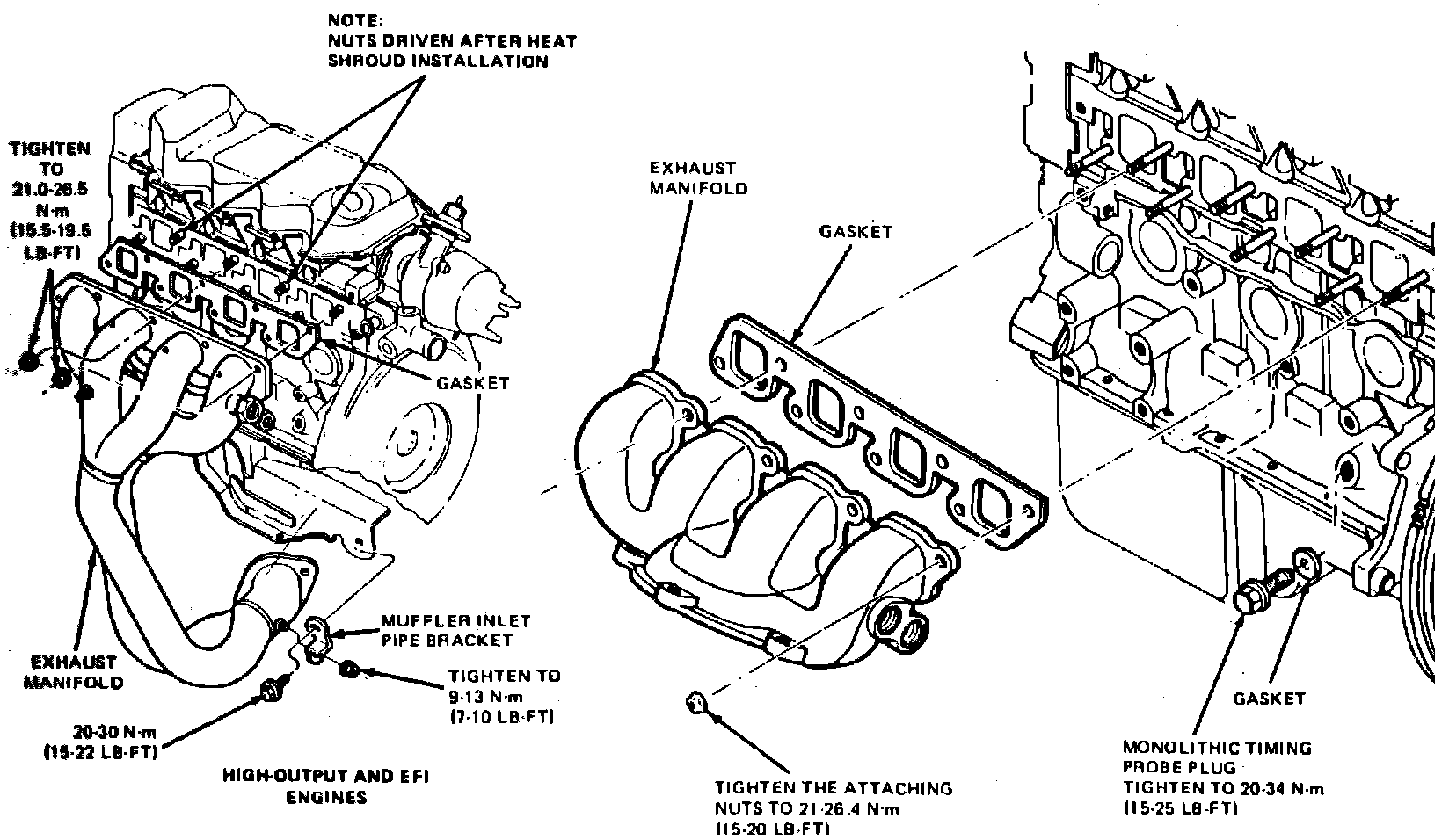 14. Reverse procedure to install. Torque exhaust manifold nuts to 16---19 ft. lbs.