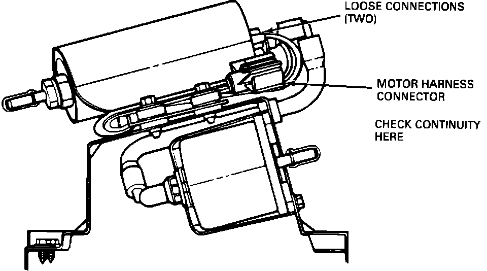 2. Attach continuity tester leads to the two terminals in the pump motor harness connector. Push and pull lightly on connectors located under rubber boots and observe tester for opens or intermittent continuity.