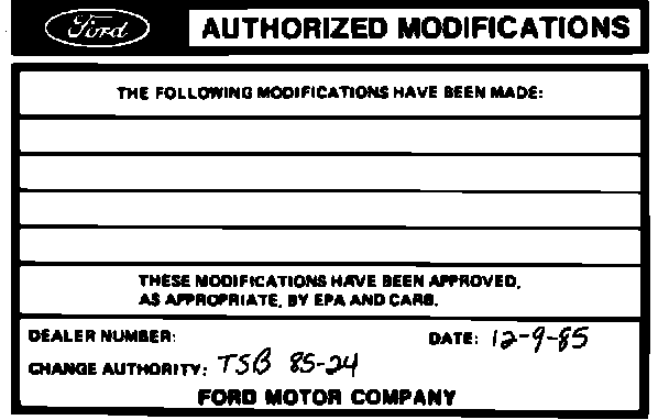 4. Obtain an Authorized Modification Decal and list the date, dealer number and summary of alterations performed. Select a prominent place adjacent to the Vehicle Emission Control Information Decal suitable for installing the Authorized Modification Decal. Clean the area, install the decal and cover it with a clear plastic decal shield.