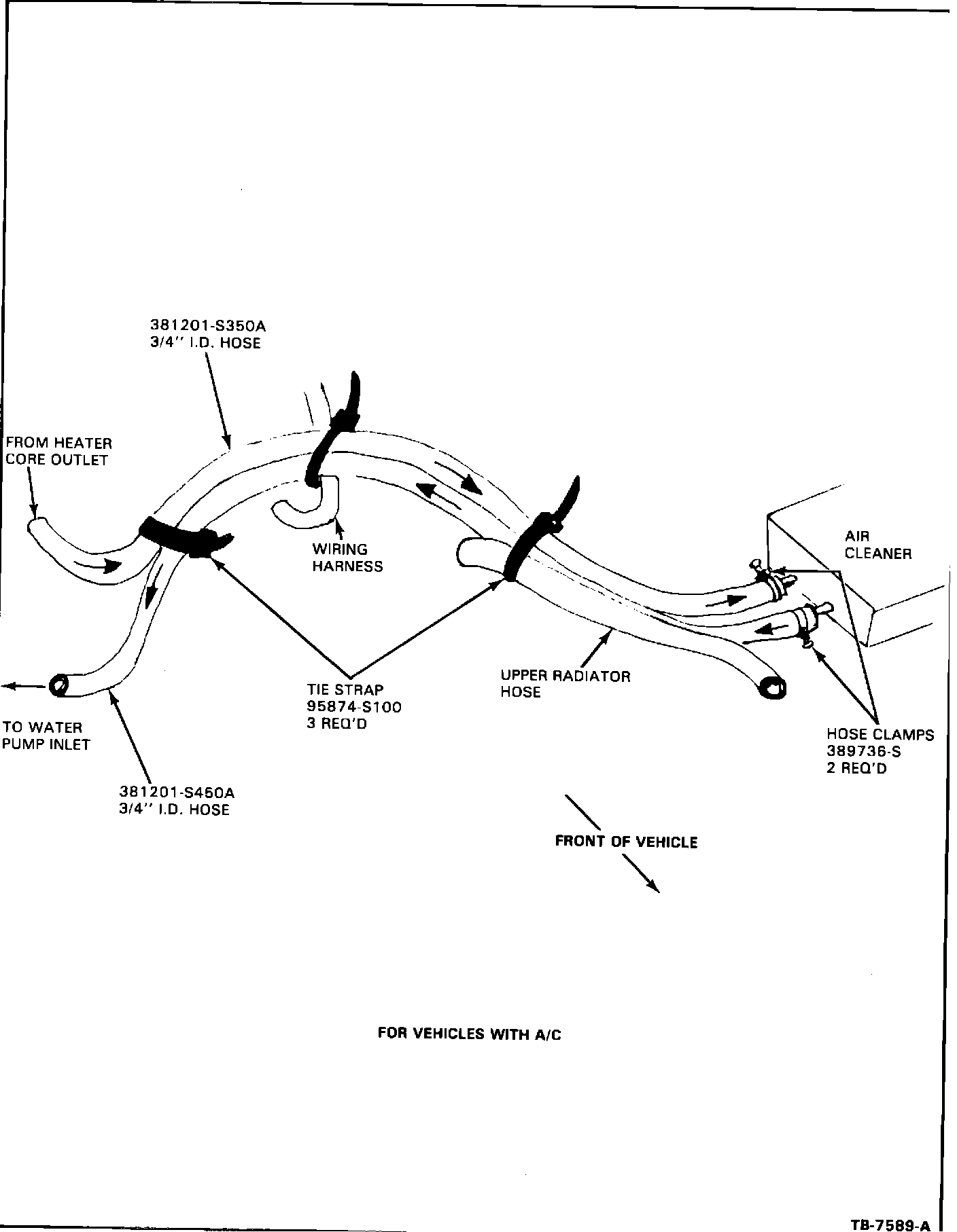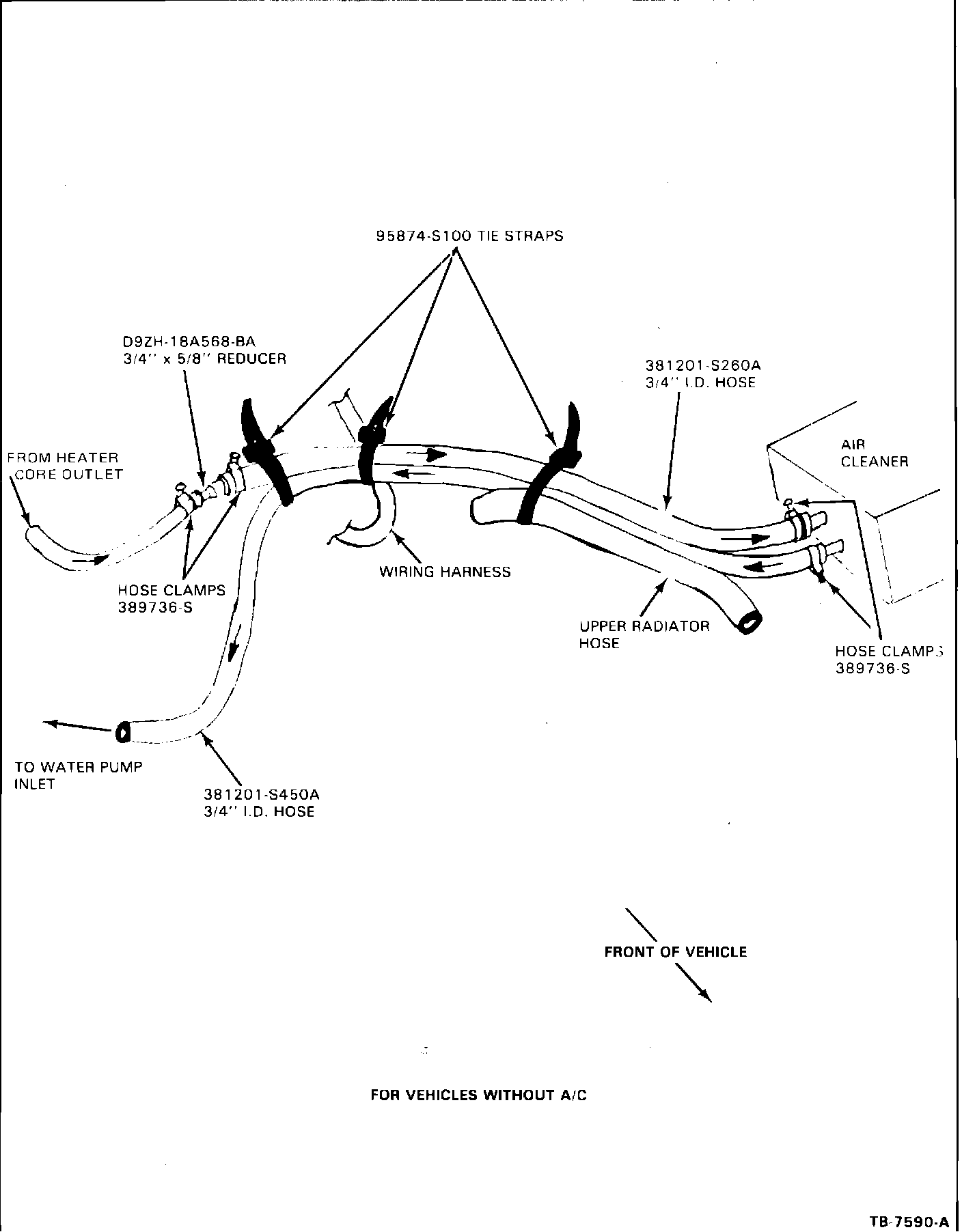 12. For non-A/C vehicles only: Loosen the hose clamp at the heater core outlet and rotate the hose approximately 90~ toward the air cleaner. Cut the free end of the hose 8" from the end. Install the hose clamps (389736-S) and the reducer (18A568) and attach to the air cleaner hose (381201-S260A). Tighten the hose clamps.