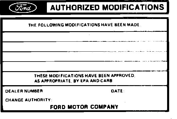 Obtain an Authorized Modifications decal and list the date, dealer number and summary of alterations performed. Select a prominent place adjacent to the Vehicle Emission Control Information decal suitable for installing the Authorized Modifications decal. Clean the area, install the decal and cover it with a clear plastic decal shield.