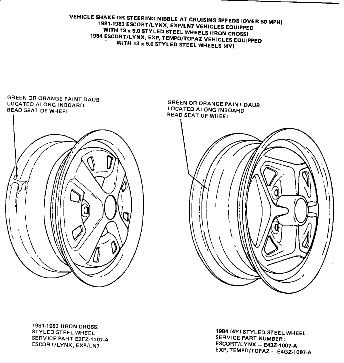 The subject condition may occur on 1981-83 Escort/Lynx, EXP/LN7; 1984 Escort/Lynx, EXP, Tempo/Topaz with 13" x 5.0" styled steel wheels (Iron Cross and 4Y) if the tire/wheel center rib runout (CRRO) exceeds .030". Service as follows: