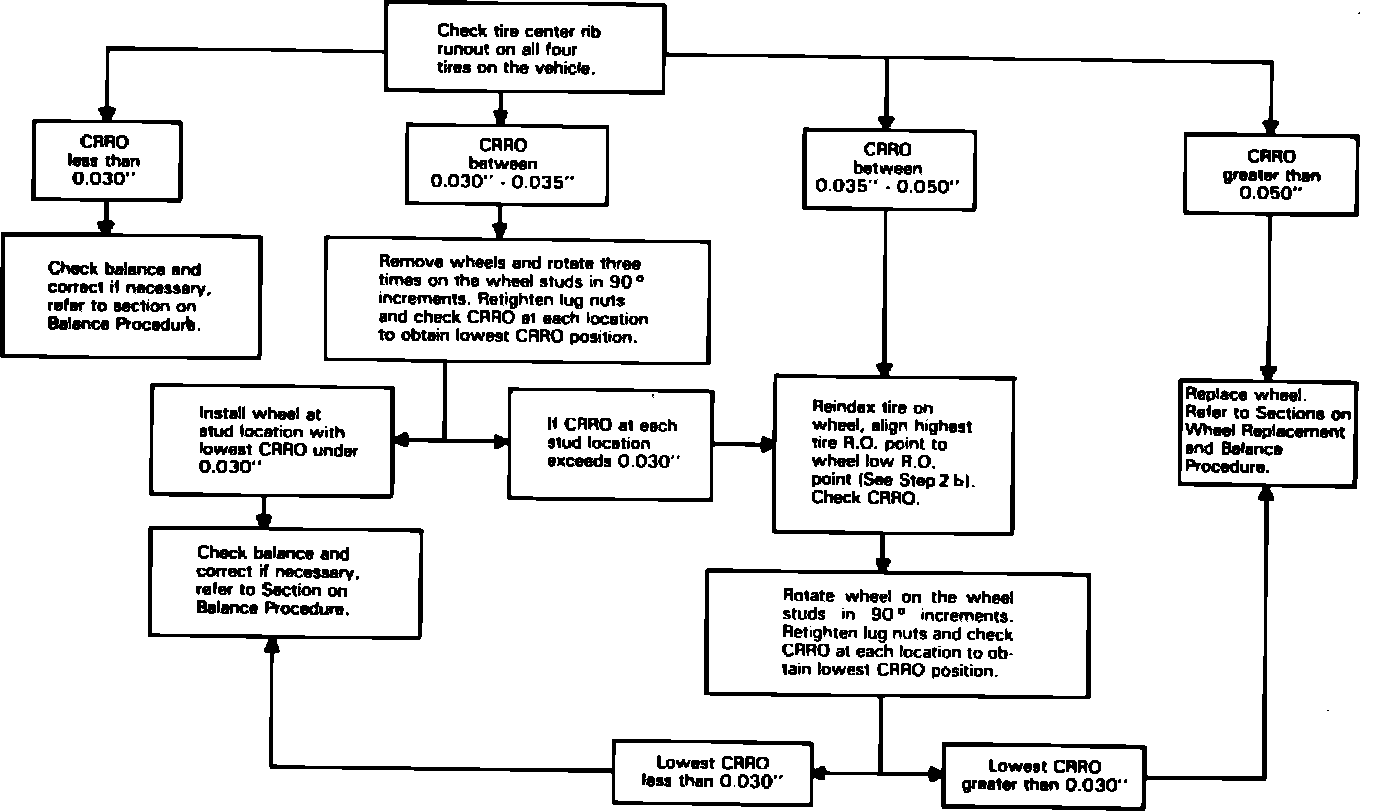 1. If runouts are less than .030" check balance, and balance if required. Refer to paragraph on checking and balancing wheels. 2a. If the runout is between .030" and .035", a reduction in runout can be obtained by reorienting the wheel on the hub (wheel studs). Remove wheel and rotate 90~ relative to wheel studs, retighten lug nuts and recheck CRRO. Repeat two more times if necessary to reduce runout to less than .030". 2b. If runouts are between .035" and .050", mark the point of highest runout on tire. Remove tire/wheel assembly from car, place on tire changer, break both bead seats but do not remove tire from wheel or rotate the tire relative to wheel. Inspect drop well for orange or green paint daub which marks low point of wheel runout (see paragraph on wheel replacement for description of markings) and mark this location on tire with an "X" (or other type of mark to distinguish it from point of high tire/wheel assembly runout). Rotate tire on wheel until mark on tire representing high point of assembly runout lines up with orange or green paint daub on wheel (it may be necessary to mark the location of the paint daub on the outside of the wheel rim). Inflate tire, mount on vehicle and check CRRO. (if runout is between .030" and .035", use procedure 2b.) If the runout cannot be reduced to less than .030" by this procedure, the wheel must be replaced. Refer to wheel replacement procedure in this article. 2c. After the runouts have been reduced to less than .030", check and/or balance wheel using the procedure in this article.