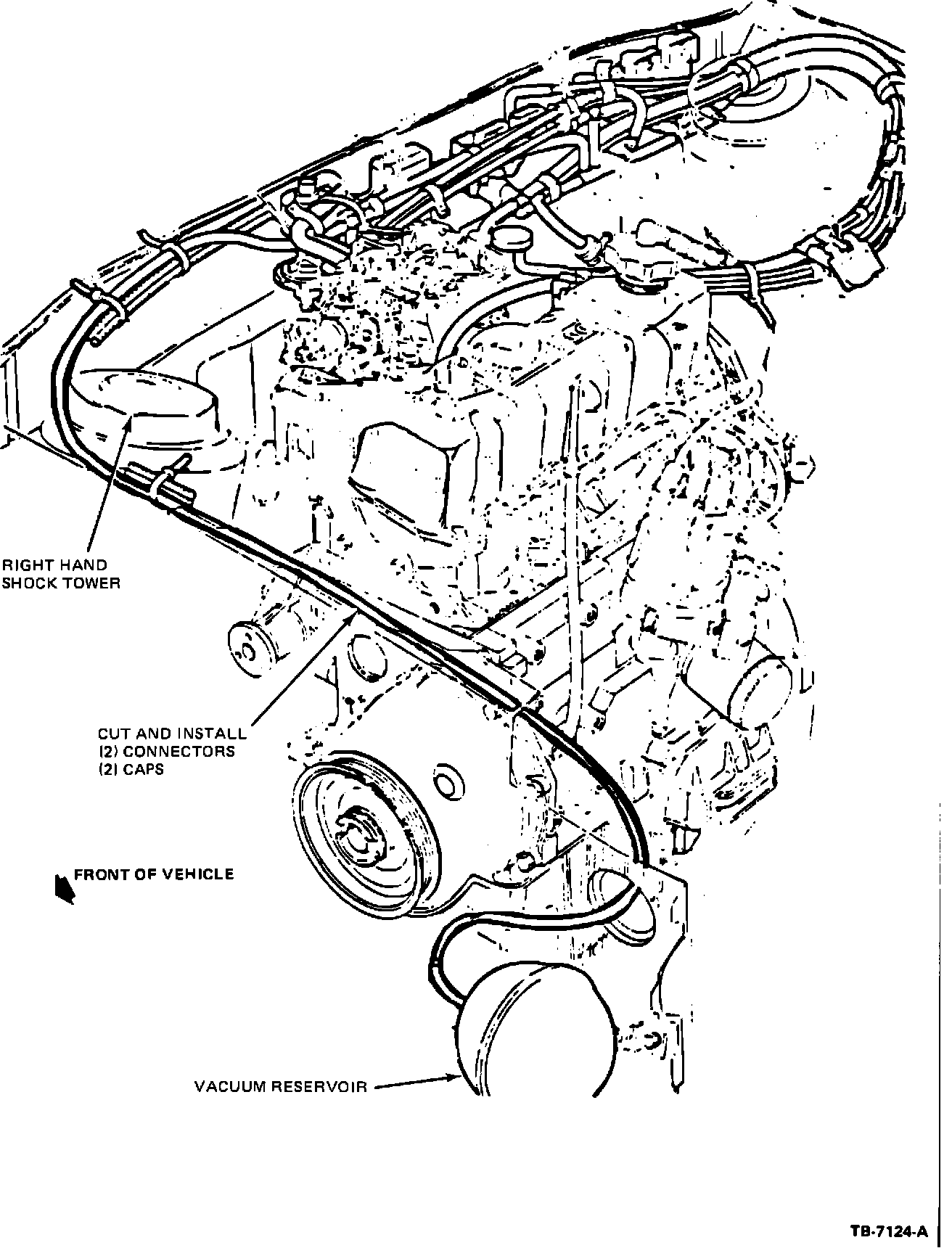 1. Locate the 5/32 (black with red stripe) vacuum hose to the vacuum reservoir. This hose is routed along the right hand fender apron between the shock tower and the radiator overflow bottle (Figure 12).