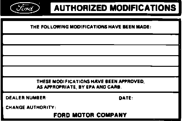 Obtain an Authorized Modifications decal and list the date, dealer number and summary of alterations performed. Select a prominent place adjacent to the Vehicle Emission Control Information decal suitable for installing the Authorized Modifications decal. Clean the area, install the decal and cover it with a clear plastic decal shield.