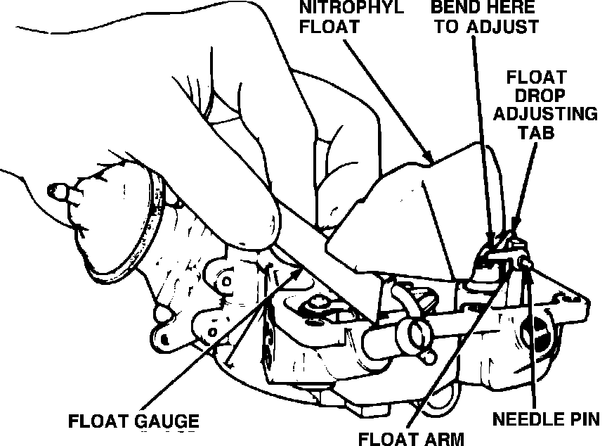 Fig. 3--Invert the air horn assembly, and check the clearance from the top of the float to the bottom of the air horn with the float level gauge. Hold the air horn at eye level when gauging the float level. The float arm (lever) should be resting on the needle pin. Do not load the needle when adjusting the float. Bend the float arm as necessary to adjust the float level (clearance). Do not bend the tab at the end of the float arm. It prevents the float from striking the bottom of the fuel bowl when empty.