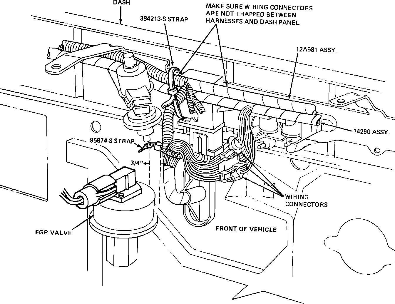 3. If any of the 12A581 takeout wires are routed near the EGR valve, position them rearward and fasten to the wiring harness trunk with a 95874-S tie strap.