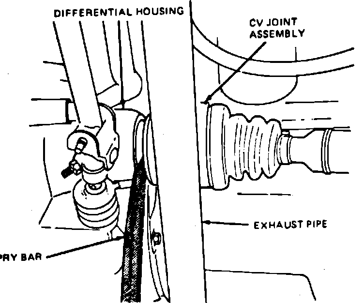 6. Remove halfshaft from differential housing using suitable pry bar. Use caution not to damage dust deflector located between shaft and case, Fig. 2. If an automatic transaxle halfshaft assembly cannot be removed from differential by using a pry bar, insert a large bladed screwdriver between differential pinion shaft and inboard constant velocity joint stub shaft. Sharply tap on screwdriver handle, to free halfshaft from differential. Use caution not to damage differential oil seal, constant velocity joint boot or constant velocity joint dust deflector.
