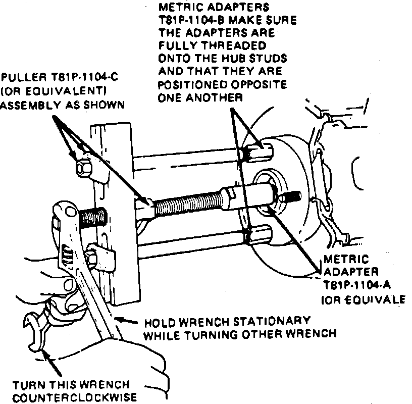 7. Separate outer constant velocity joint from hub using puller T81P-1104C or equivalent, Fig. 3, and adapters T81P-1104B and T81P-1104A or equivalent. Do not use a hammer to separate outboard constant velocity joint stub shaft from hub as damage to internal components may result.