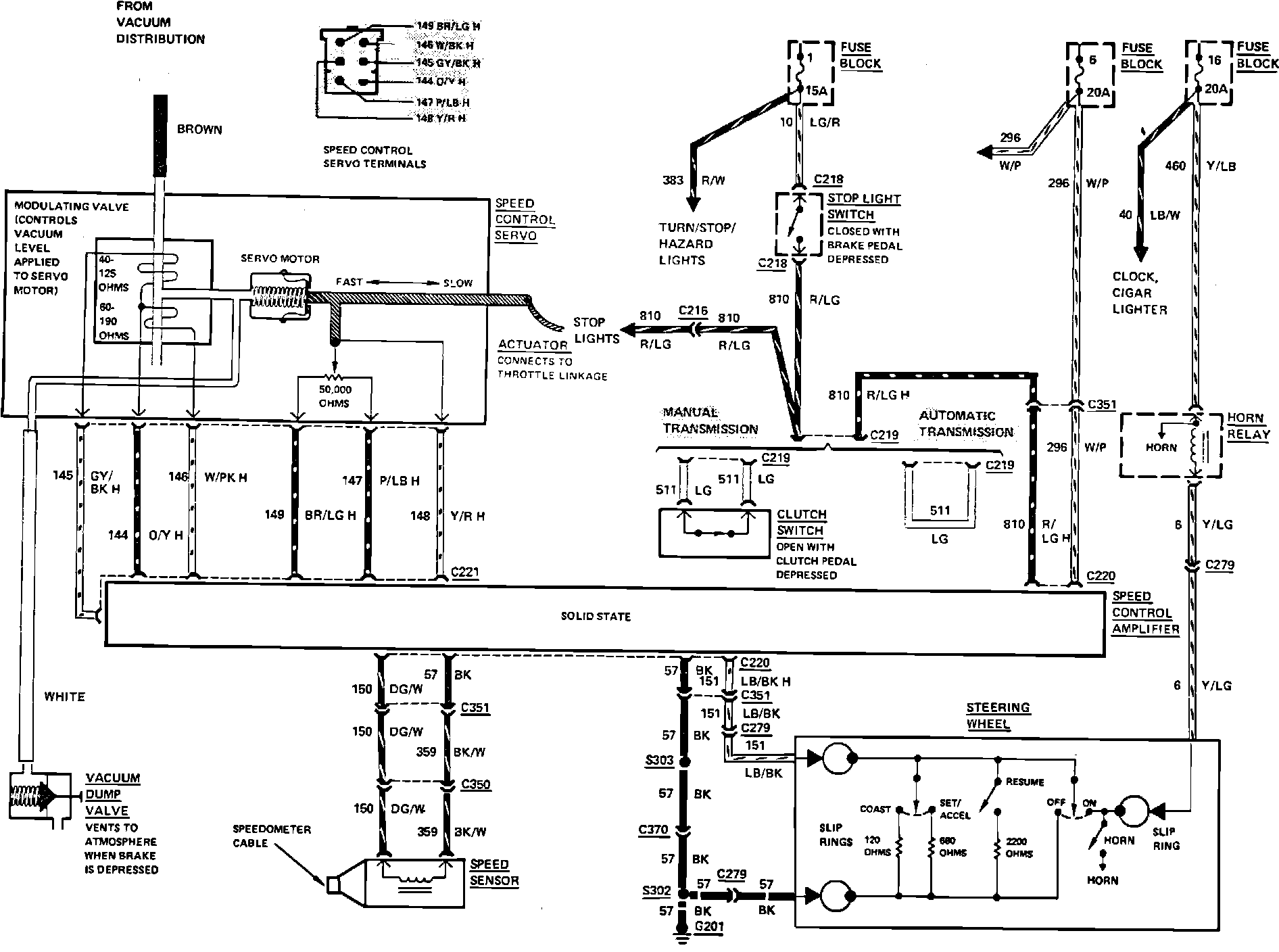 Fig. 1 Speed control wiring schematic (typical). 1982---83 Fairmont & Zephyr, 1982---87 Mustang & Capri; 1982 Granada; 1982---83 Cougar; 1983---86 LTD & Marquis: