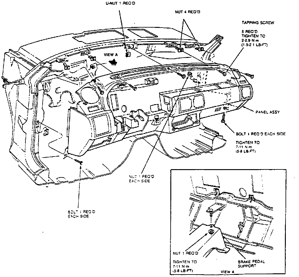 12. Remove brake pedal support nut, then five cowl top screw attachments.