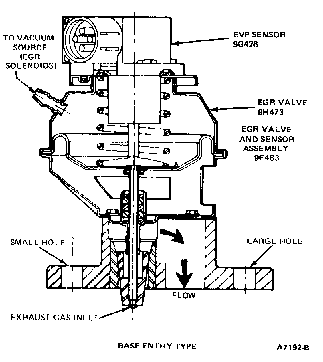 The valve is operated by a vacuum signal from the dual EGR Solenoid Valves (9D474) or the electronic vacuum regulator (9J459) which actuates the valve diaphragm.