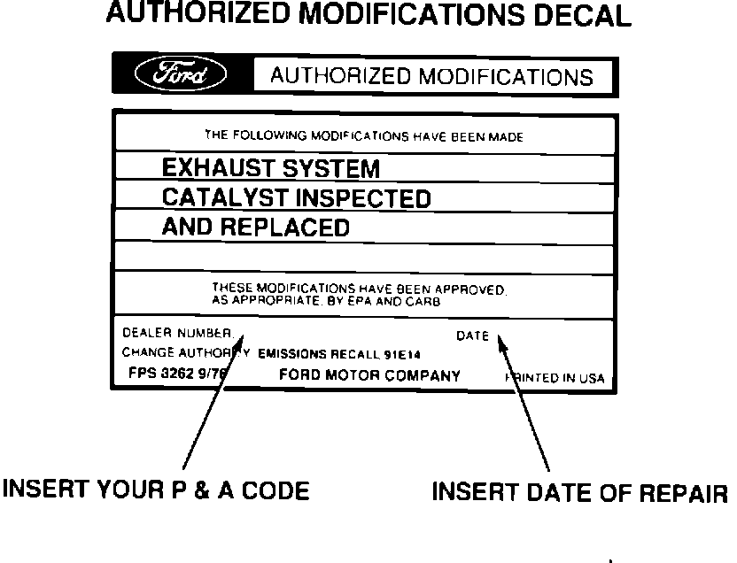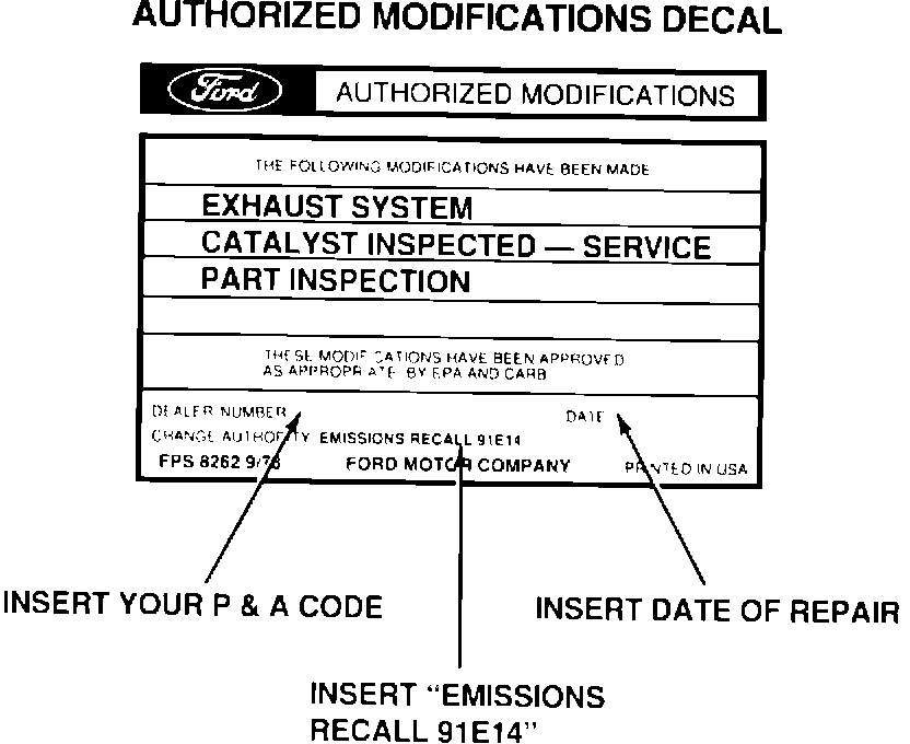 Insert your dealer P&A code, "Emissions Recall 91E14" and the date of service. Affix the decal to a clean, flat surface on the fan shroud. Install the clear overlay over the decal.