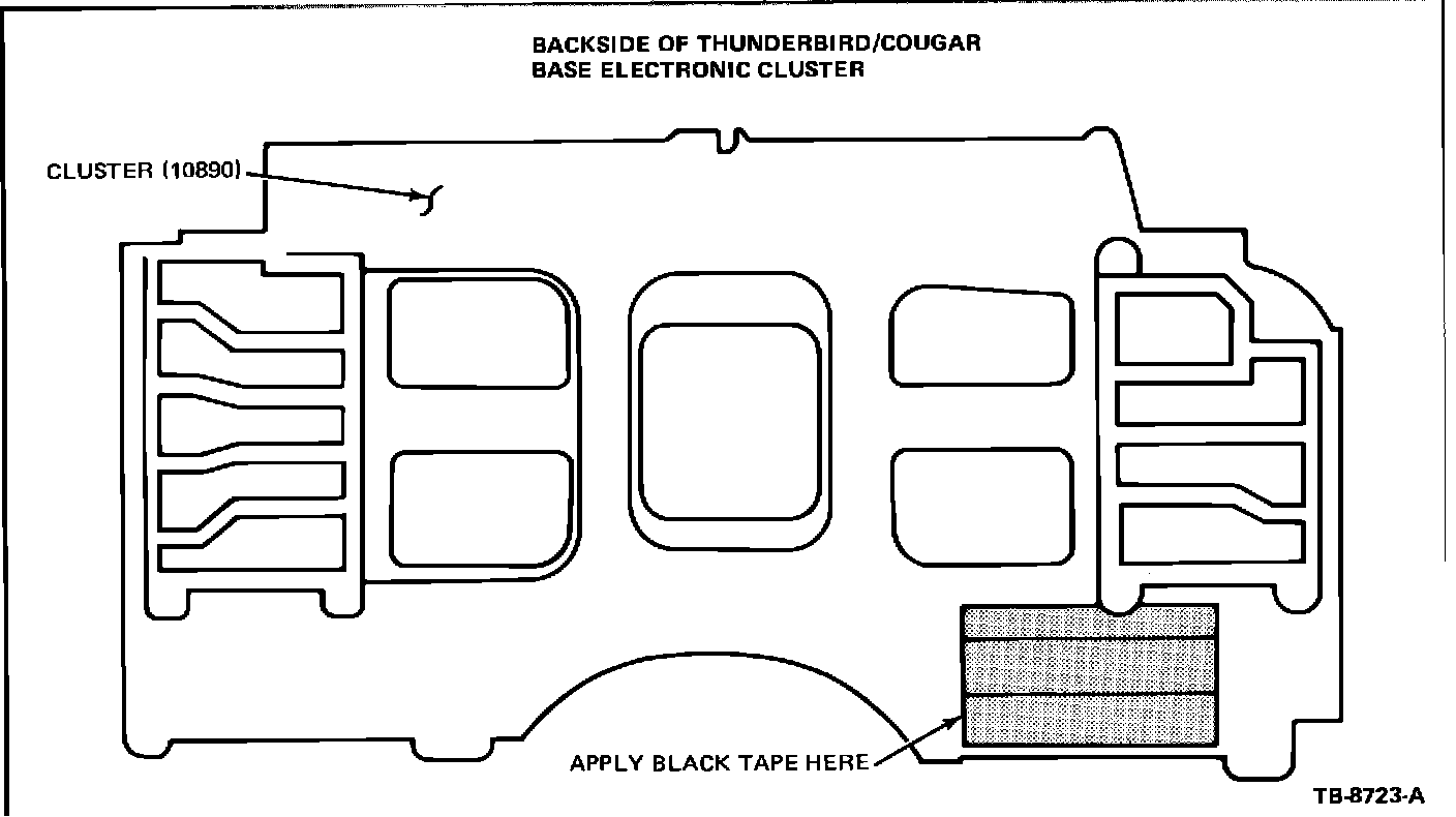 Vehicles built between May 1, 1986, and May 22, 1986, may have instrument cluster light "bleed through" the "Check Engine" indicator. To correct this, remove the instrument cluster as outlined in the 1986 Car Shop Manual, Section 33-05. Apply black electrical tape to the area shown in Figure 9 and reinstall the instrument cluster.