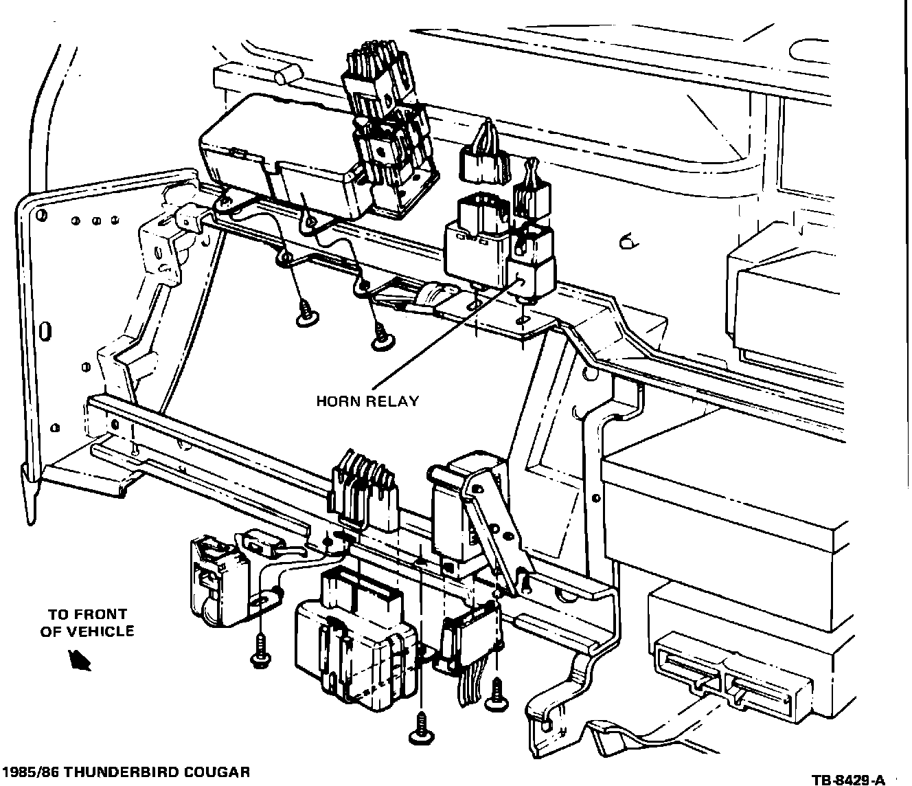 The 1985-86 Electrical and Vacuum Troubleshooting Manual (Thunderbird/Cougar) indicates that the horn relay is located behind the left hand side of the instrument panel (see page 145 of the EVTM). This is incorrect. The horn relay is located on the right hand side of the instrument panel above the glove box, as shown in Figure 4. Please make this notation in your EVTM.