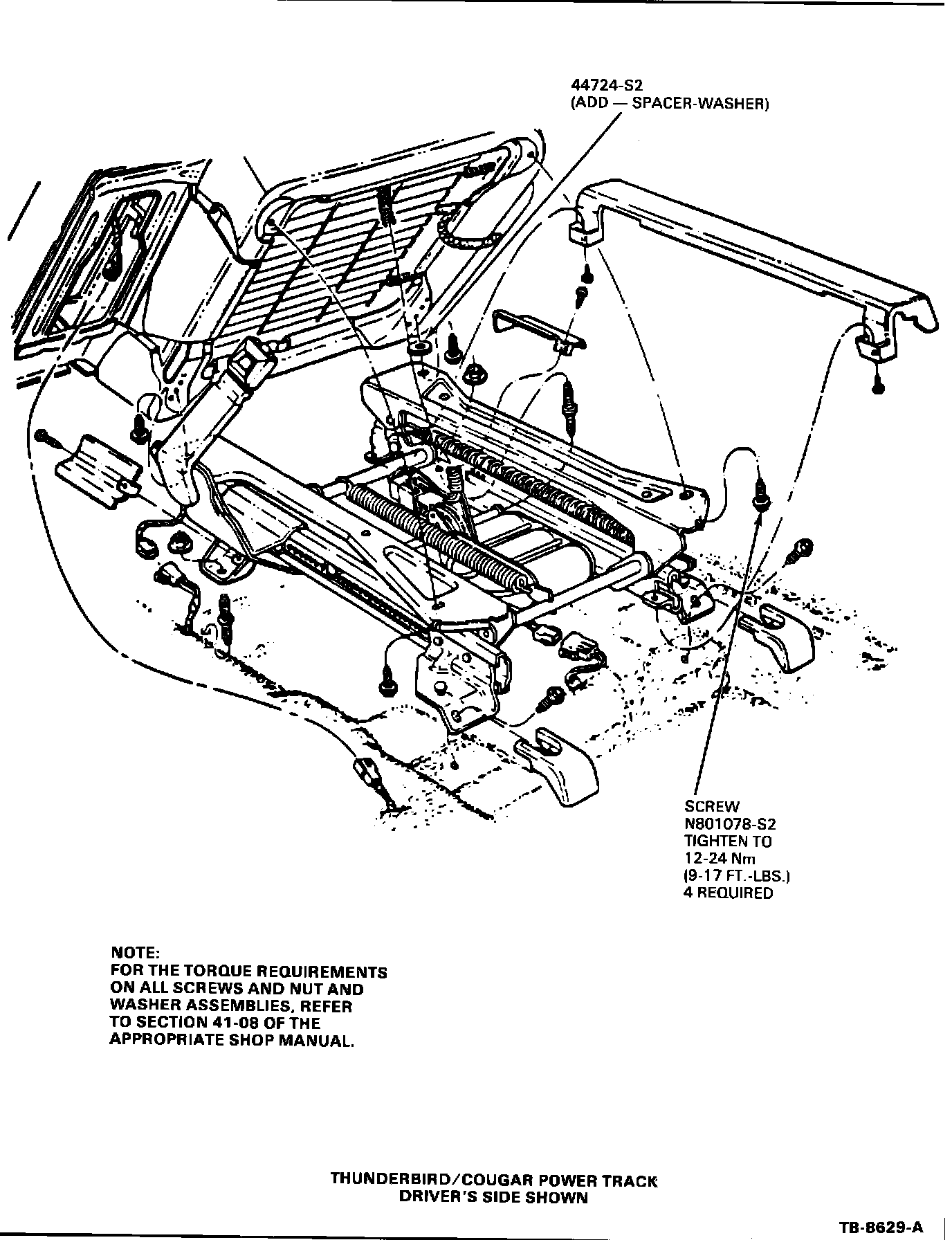 5. Secure the seat and track assembly in the vehicle. Refer to Section 41-08 of the appropriate Shop Manual.