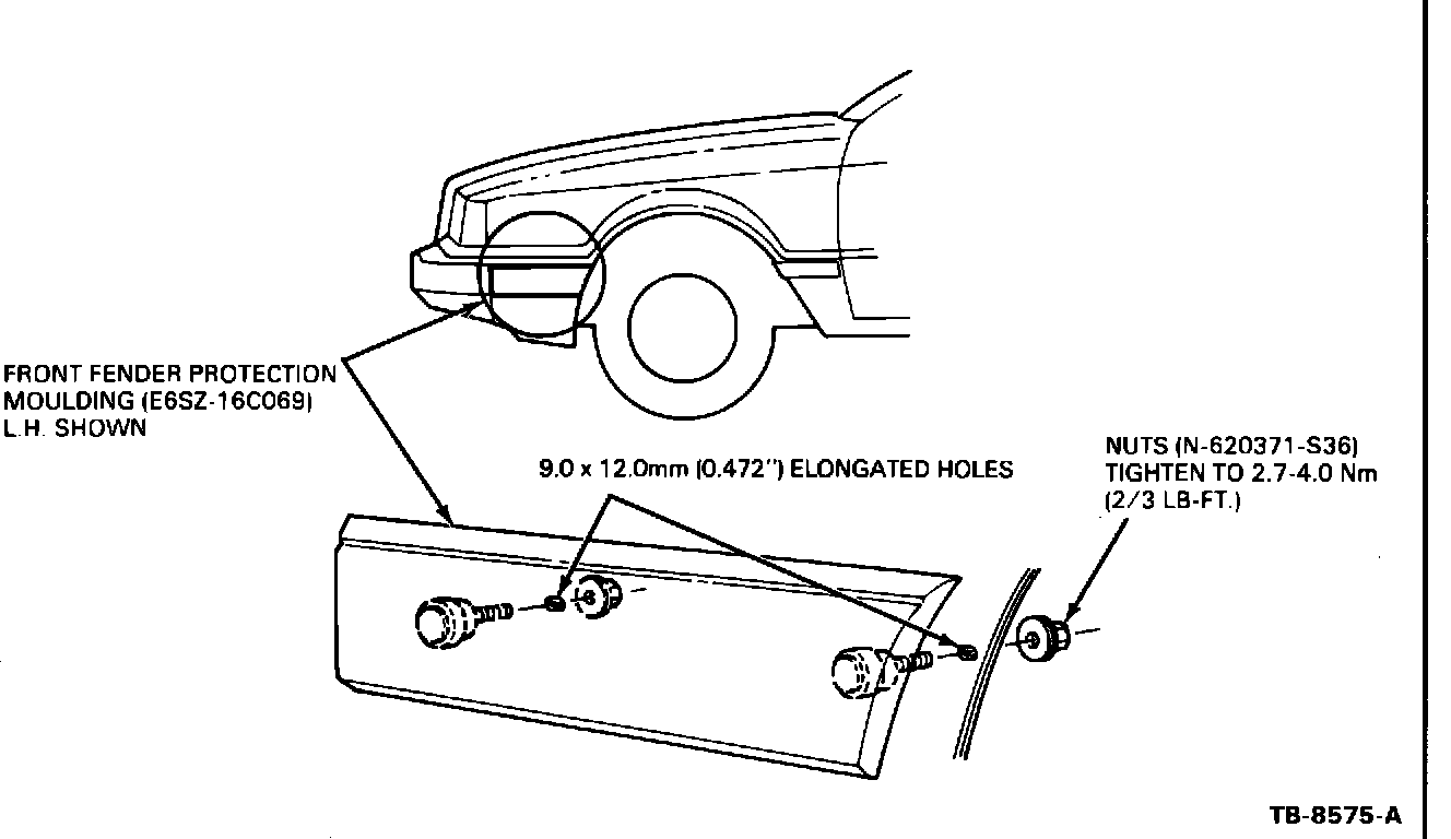 Loose or missing front fender protection mouldings may be caused by mouldings lacking flexibility and proper adhesion to conform to sheet metal contour. To correct this condition, a newly designed moulding with attaching studs is available to replace the existing front fender moulding. To install, the front fender will have to be drilled in two (2) locations to accommodate the studs. Closely follow the installation instructions and Figure 3 for the best results.