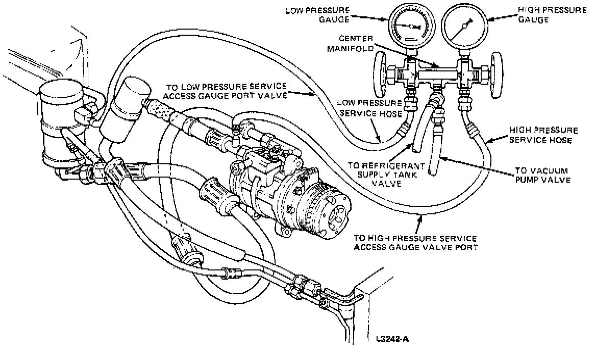 5. Connect the manifold gauge set high and low pressure hoses, with adapters, to the respective high and low pressure service access gauge port valves.