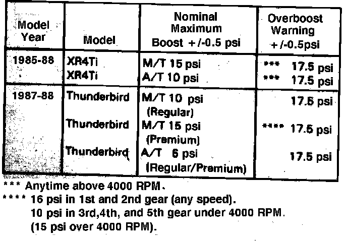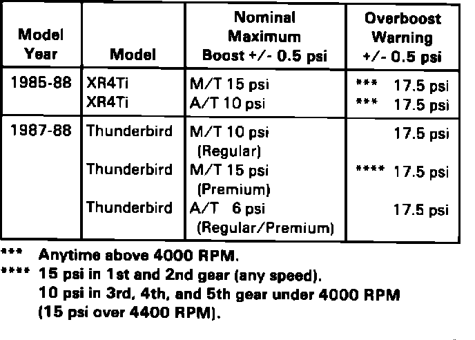 When the fuel selector switch is in the PREMIUM position, the EEC module sends open and close commands to the turbo boost control module which, in turn, energizes or de-energizes the solenoid. When the solenoid is energized, a portion of the pressure signal to the wastegate actuator is diverted to the inlet side of the boost solenoid. This will result with higher boost pressures 89.6-110.3 kPa (13-16 psi) maximum. Boost pressure varies between 68.95 and 110.3 kPa (10 and 16 psi) depending on rpm, vehicle, speed and transmission gear selection. See Note (B).