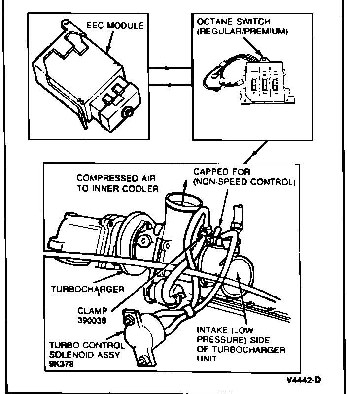 The turbocharger boost control system is designed to provide electronic variable boost control on the 2.3L electronic fuel injected turbocharged engine. The boost control system provides regulation of the wastegate actuator signal allowing turbo boost pressures up to 89.6-110.3 kPa (13.0-16.0 psi) on manual transmission vehicles and 55.1-75.8 kPa (8.0-11.0 psi) on automatic transmission vehicles. The system includes a control module, solenoid/hose assembly, calibrated "T" fitting and all controlled by the EEC module (Fig. 1). The boost control system is activated in the PREMIUM fuel selection position only, on manual transmissions. On automatic transmissions, it is activated in both the REGULAR and PREMIUM positions. See Note (A).