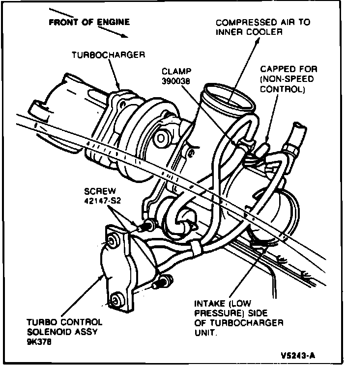 2. Remove control solenoid hose clamps at turbocharger. Carefully pull hoses away from fittings on turbocharger.