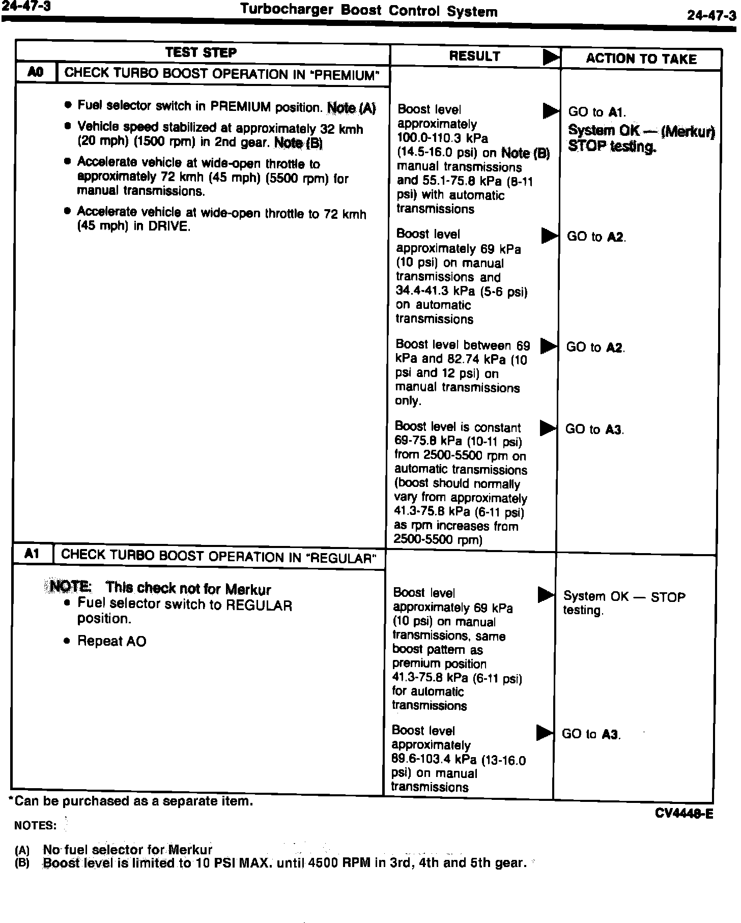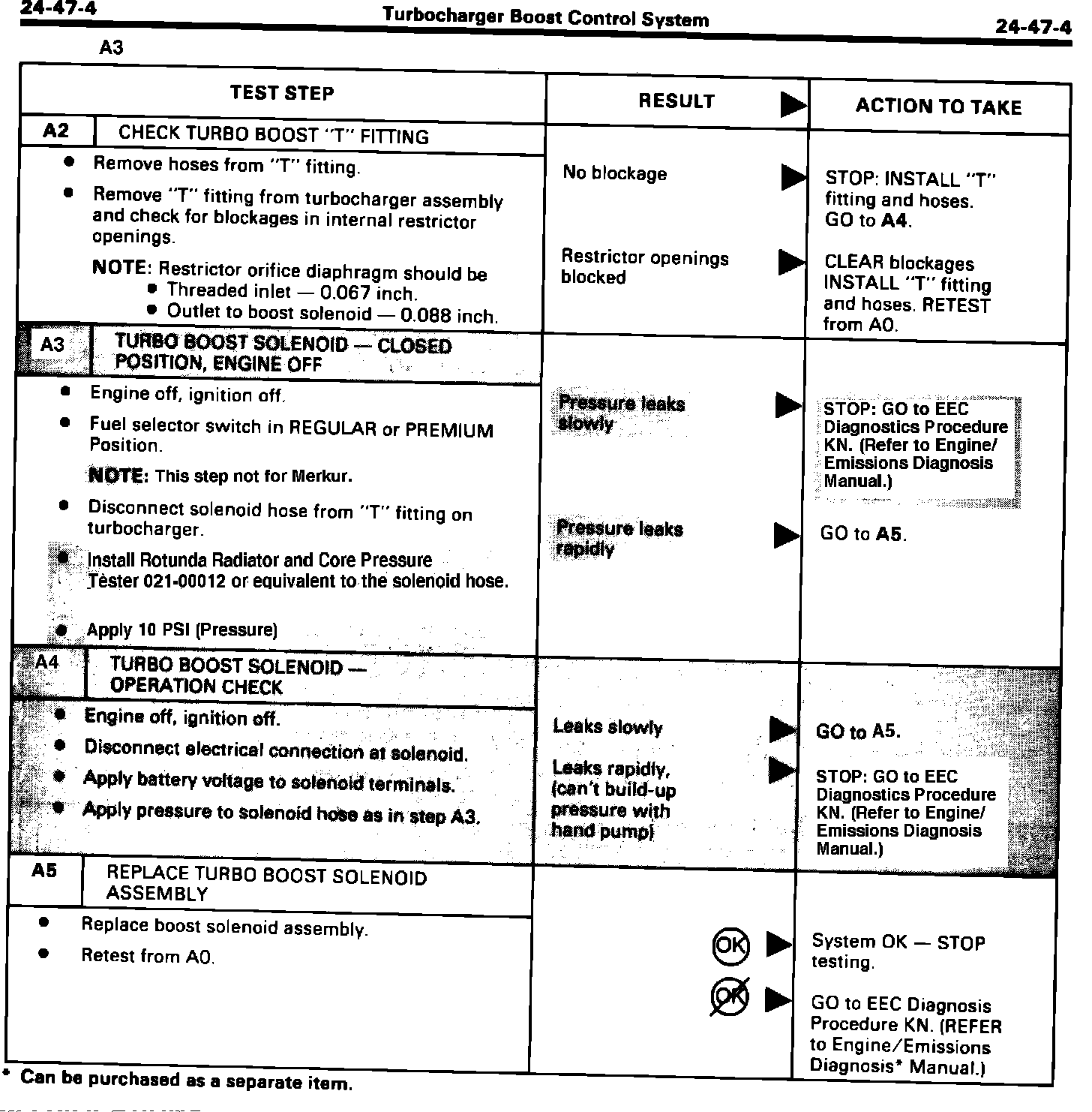 ISSUE: The turbocharger and boost control solenoid diagnostic procedures as published in the 1987 and 1988 Car Shop Manual, Volume D, Section 24-47 "Turbocharger Boost Control System" and the Merkur XR4Ti Shop Manual, Section 24-01 are incorrect. This incorrect information may have been responsible for the unnecessary replacement of turbochargers and boost control solenoids.