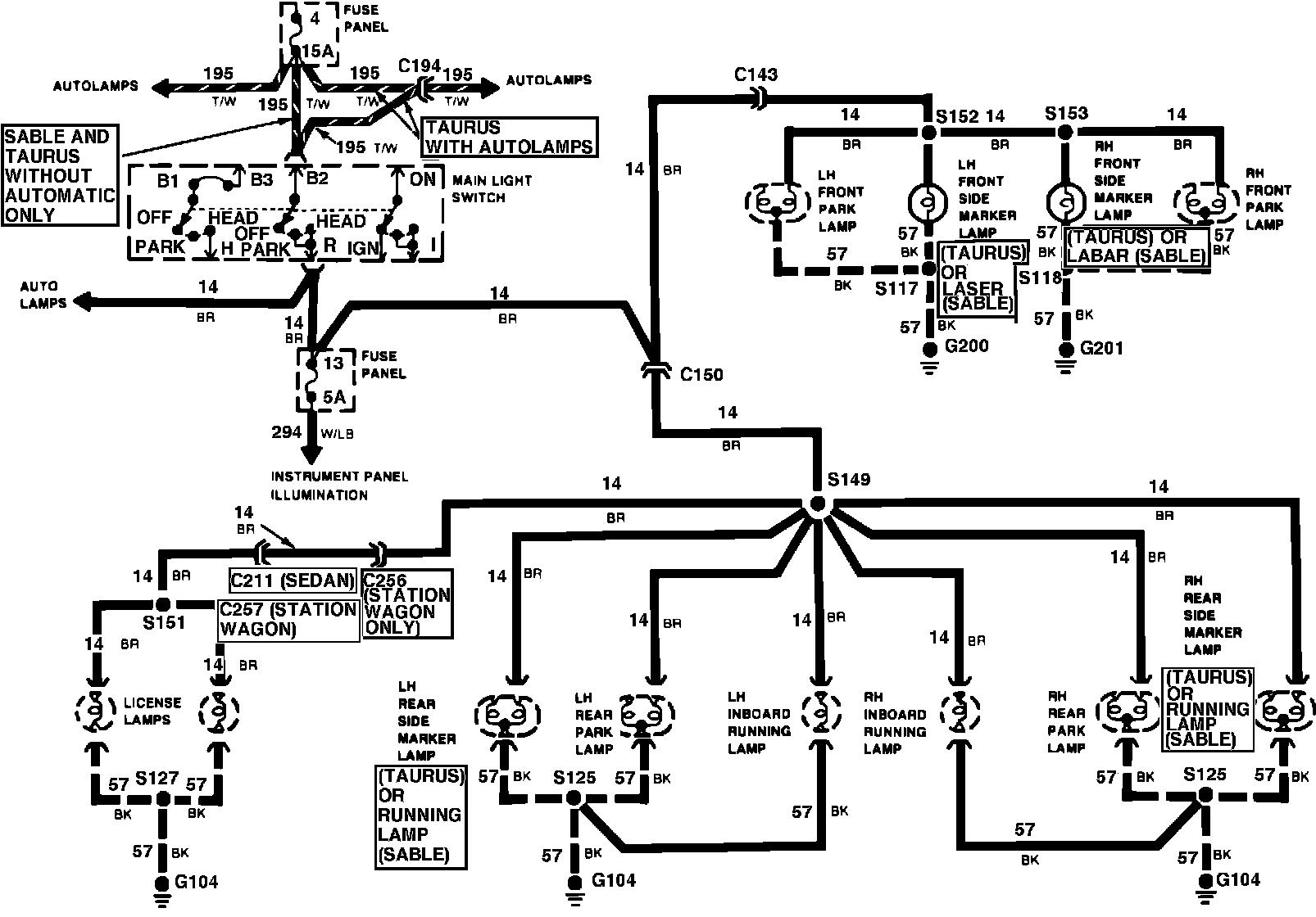 Fig. 16 Exterior Lamps Wiring Circuit (Less Diagnostic Warning). Taurus & Sable: