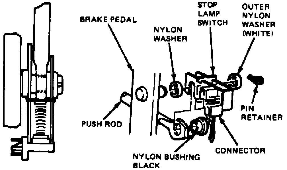 3. Position switch so U-shaped side is nearest brake pedal and directly over brake pedal pin. The black bushing must be in position in pushrod eyelet with washer face on side away from pedal arm.
