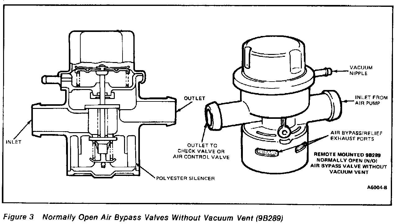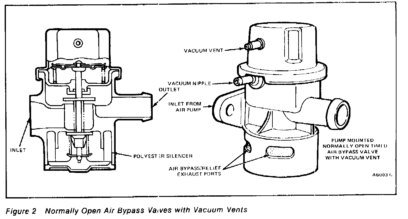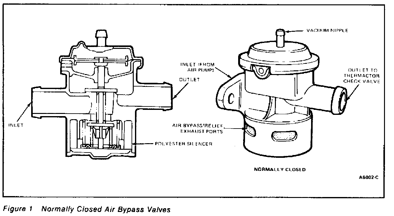 There are two general groups of Air Bypass Valves, normally closed and normally open. Each group is available in remote (in-line) versions or pump-mounted (mounted directly on the air pump) versions (Figures 1, 2, and 3). The bypass valves are part of the Thermactor System. Normally closed valves supply air to the exhaust system with medium and high applied vacuum signals during normal (engine at normal operating temperature) modes, short idles and some accelerations. With low or no vacuum applied the pump air is dumped through the silencer ports of the valve.