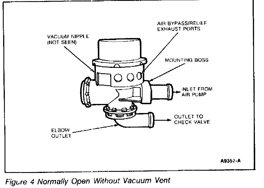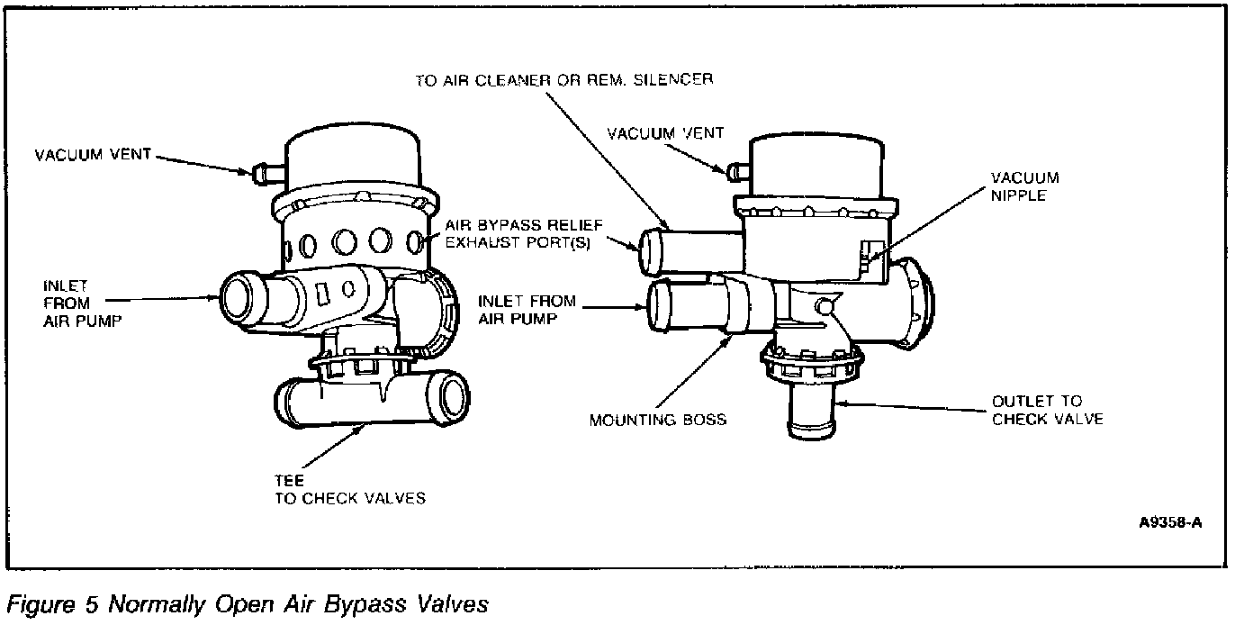 Normally open valves with a vacuum vent provide a timed air dump during decelerations and also dump when a vacuum pressure difference is maintained between the signal port and the vent port. The signal port must have 10 kPa (3 in Hg) more vacuum than the vent port to hold the dump. This mode is used to protect the catalyst from overheating.