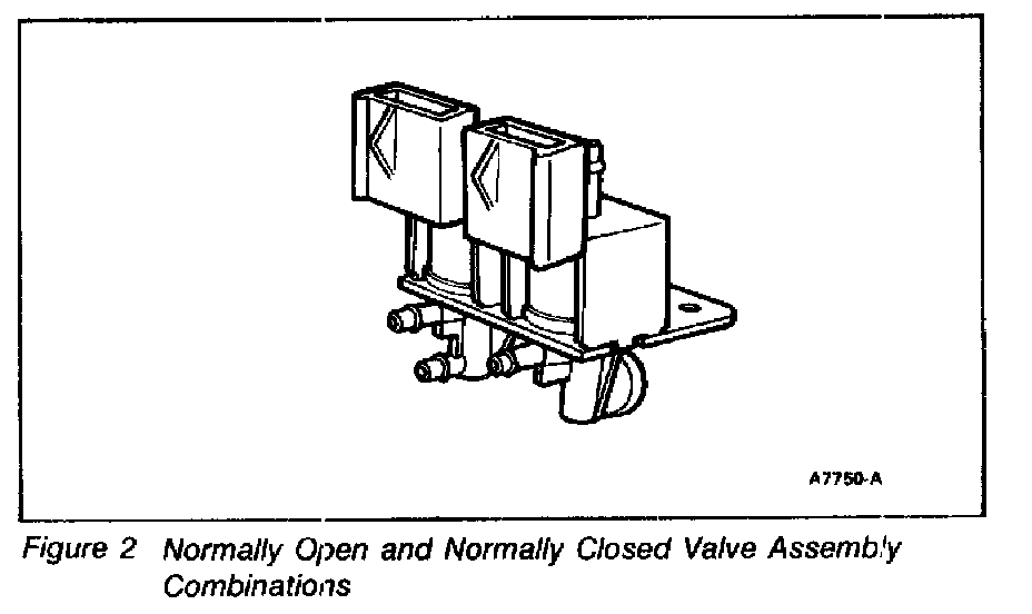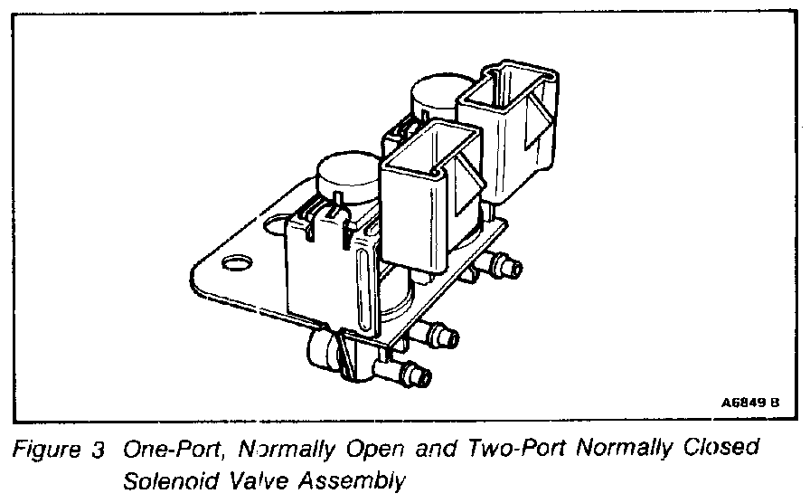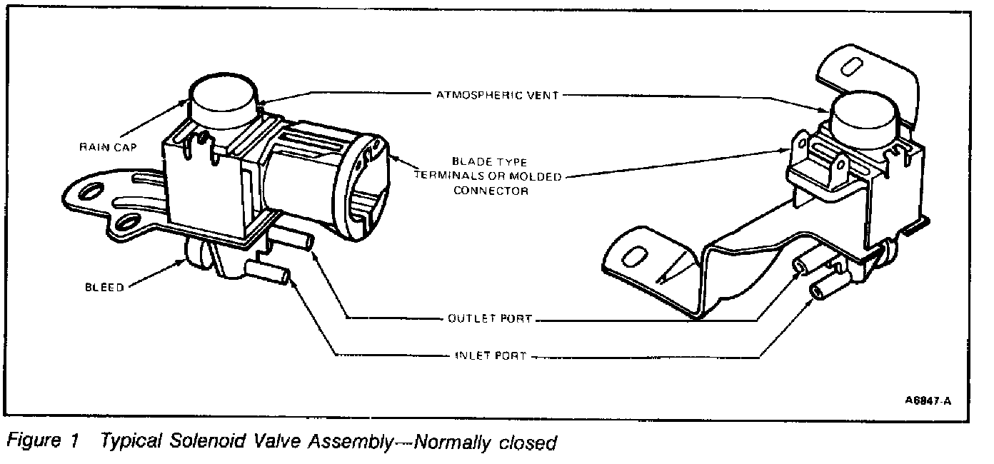 The one-port, normally open and the two-port normally closed solenoid valve assembly, Figure 3 is used for choke pull-down and A/C throttle kicker.