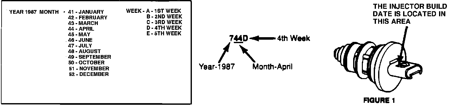 3. Refer to Figure 1, below. Look at the side of the injector electrical connector for the build date. (Three numbers followed by one letter). Using the following chart, interpret the injector build date 744D as per example.