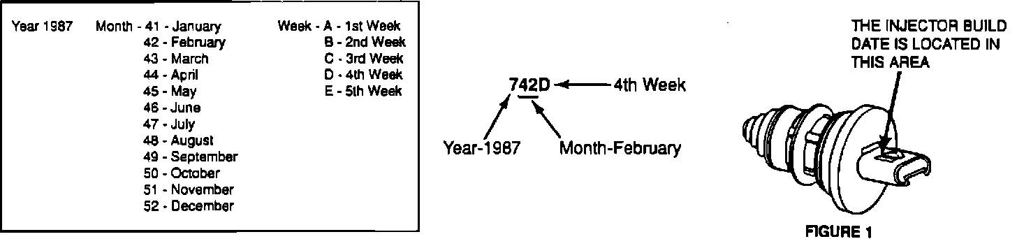^ Refer to Figure 1, below. Look at the side of the injector electrical connector for the build date. (Three numbers followed by one letter). Using the following chart, interpret the injector build date 742D as per example.