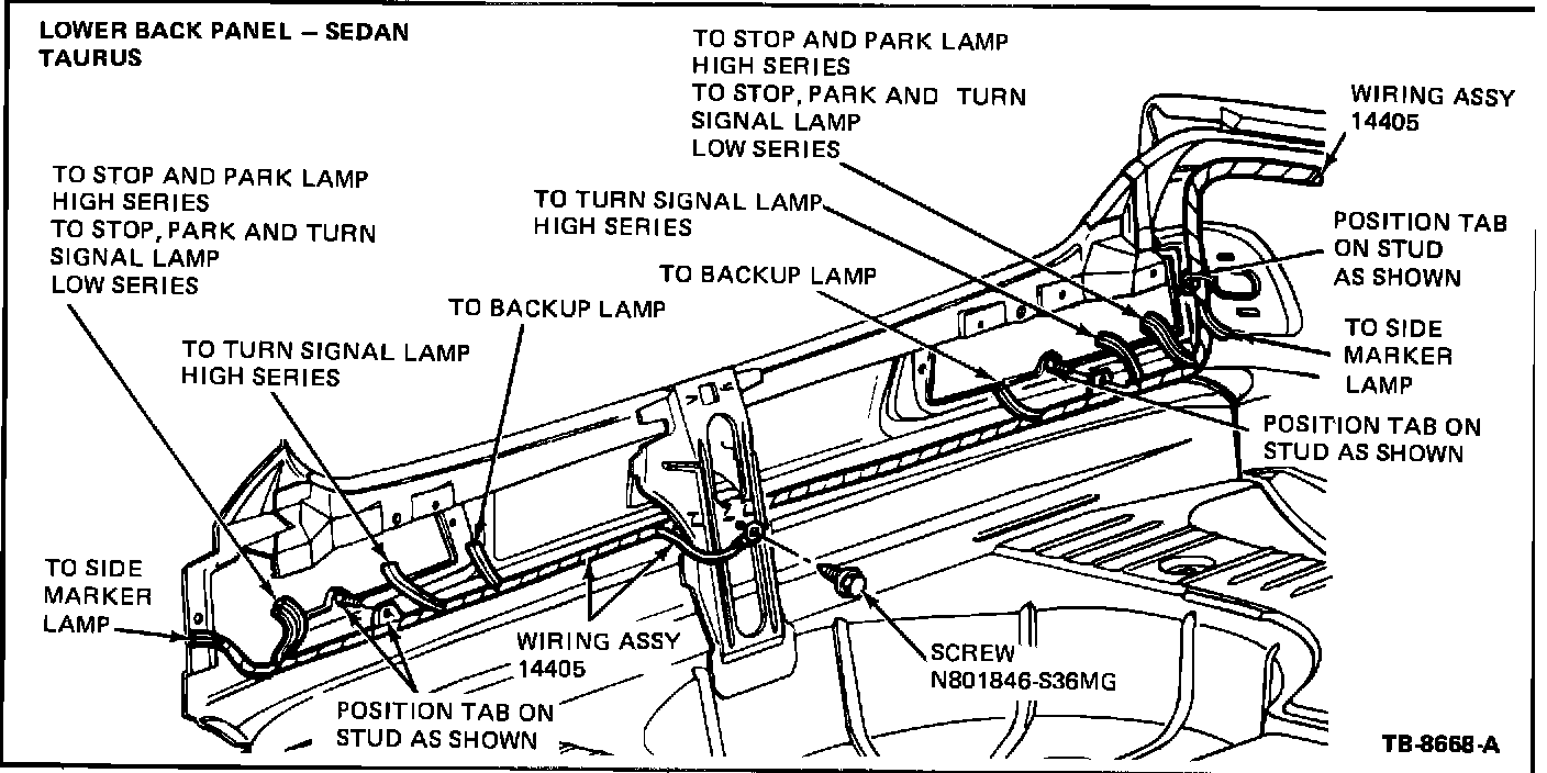 The 1986 Electrical and Vacuum Troubleshooting Manual (EVTM) refers to high and low series vehicles in the lamp out diagnostic warning system, pages 113- 117. To properly identify the correct series, the Taurus/ Sable Shop Manual (34-20-11) must be used (refer to Figure 4). The correct series information is critical when ordering a 14405 wiring harness.