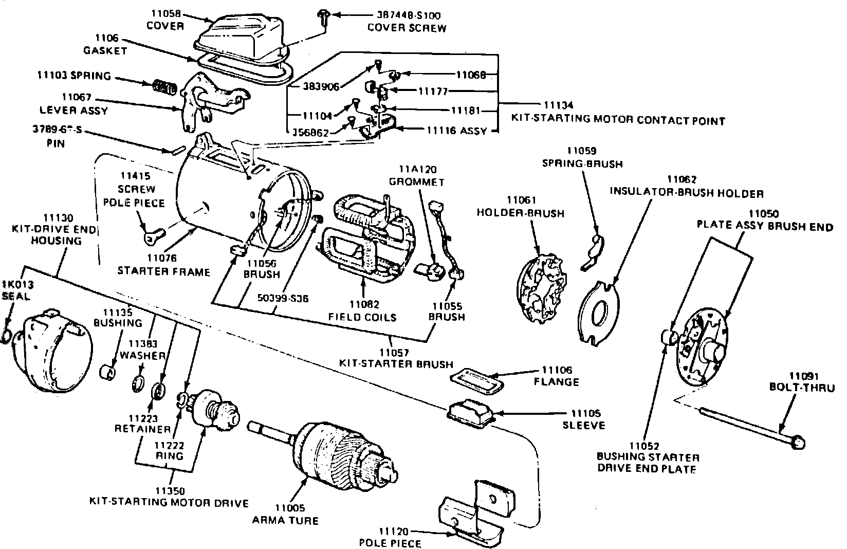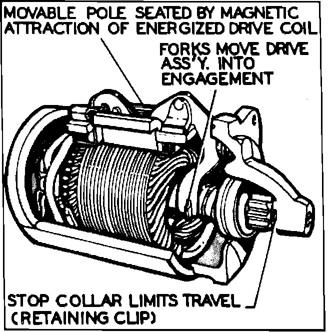 This type starting motor, Figs. 1 and 2, is a four pole, series parallel unit with a positive engagement drive built into the starter. The drive mechanism is engaged with the flywheel by lever action before the motor is energized. When the ignition switch is turned on to the start position, the starter relay is energized and supplies current to the motor. The current flows through one field coil and a set of contact points to ground. The magnetic field given off by the field coil pulls the moveable pole, which is part of the lever, downward to its seat. When the pole is pulled down, the lever moves the drive assembly into the engine flywheel, Fig. 3. When the moveable pole is seated, it functions as a normal field pole and opens the contact points. With the points open, current flows through the starter field coils, energizing the starter. At the same time, current also flows through a holding coil to hold the movable pole in its seated position. When the ignition switch is released from the start position, the starter relay opens the circuit to the starting motor. This allows the return spring to force the lever back, disengaging the drive from the flywheel and returning the movable pole to its normal position.