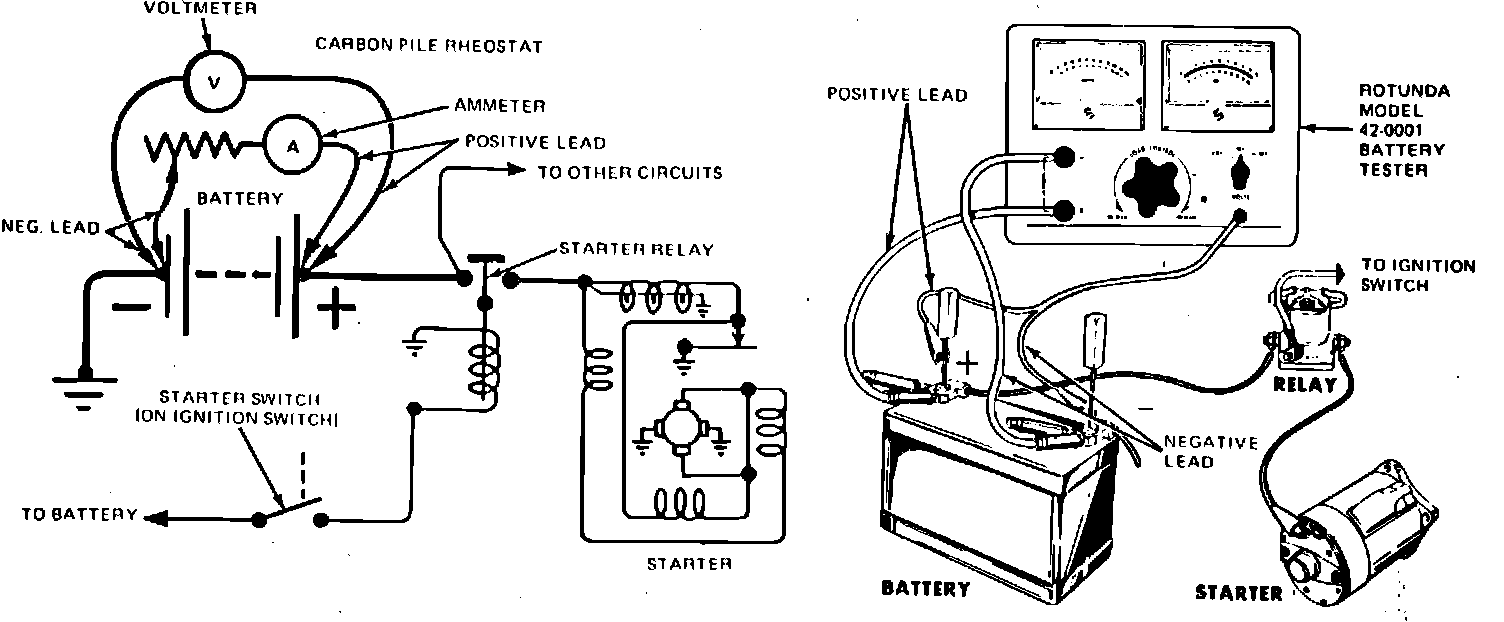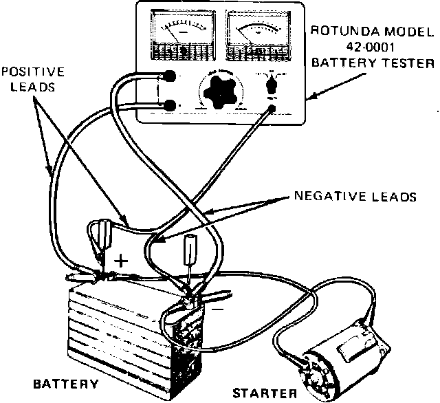 4. Stop cranking engine and reduce resistance of carbon pile until voltmeter indicates same reading as that obtained while starter cranked engine. Ammeter should read 150---250 amps.