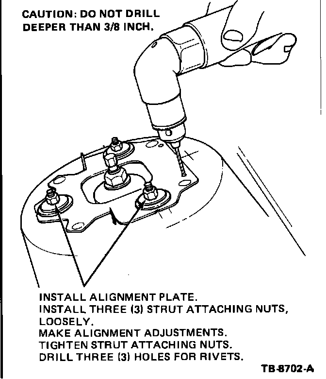 11. Drill three 3.2 mm (1/8 inch) holes through alignment plates, strut towers, and paint exposed metal.