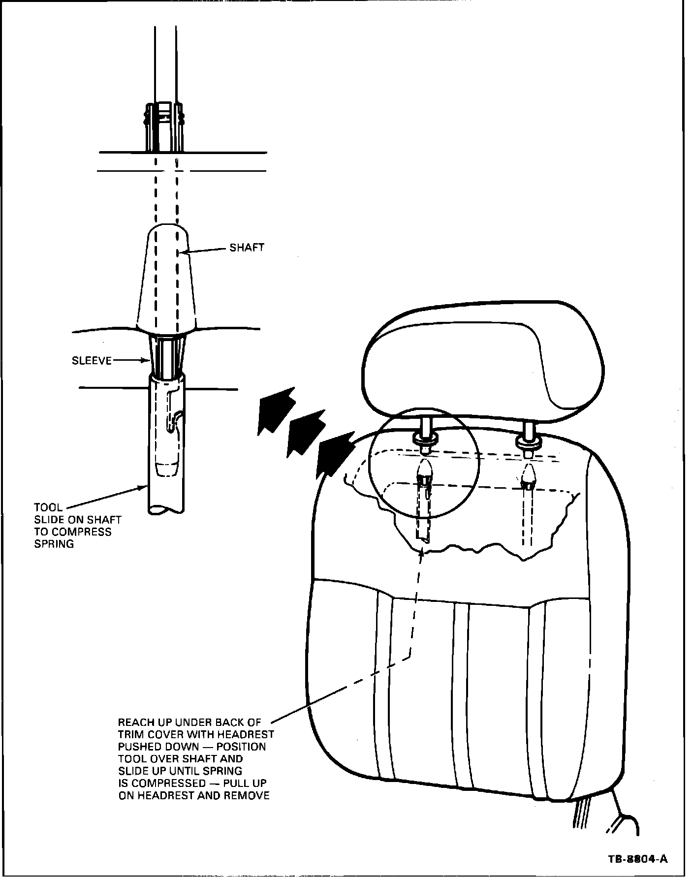 4. Reach up under or raise back of trim cover and position the fabricated tool on the headrest shaft. Remove the headrest and both sleeve caps. (Figure 5)