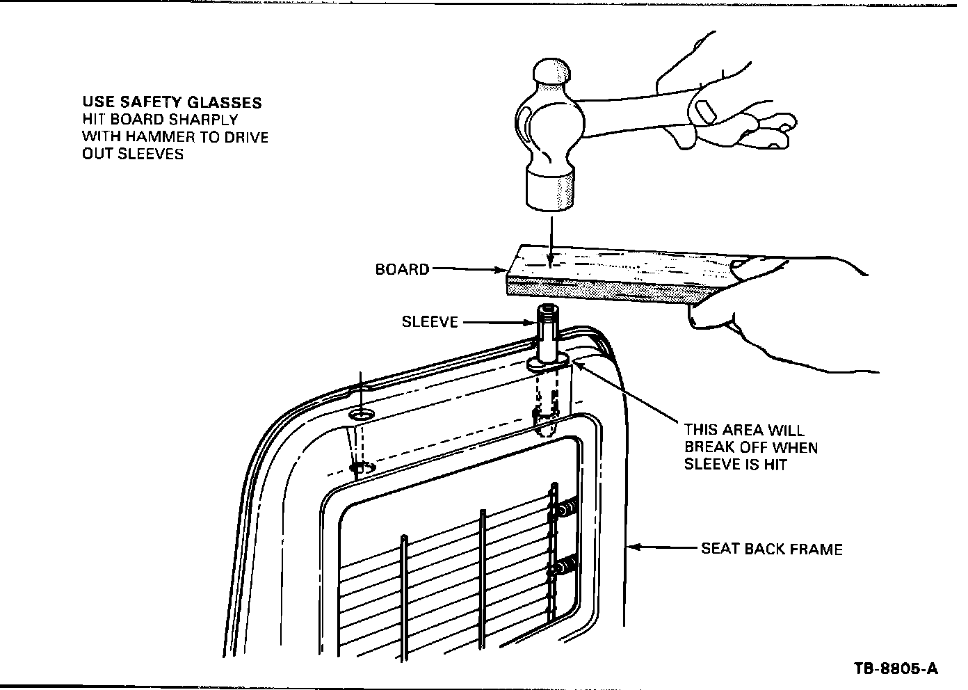 6. Place a piece of board on top of the sleeve and sharply hit the board to drive each sleeve through the seat back frame. (Figure 6)