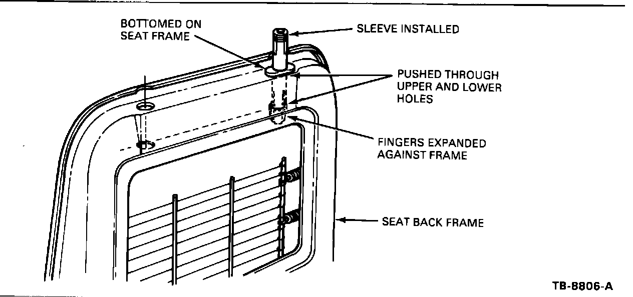 1. Push the sleeves through both holes in seat frame. Make sure the fingers on bottom of sleeves are expanded at the bottom hole. (Figure 7)