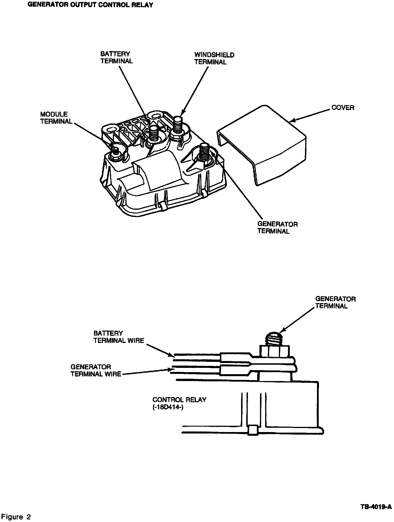 6. Locate the Alternator Output Control Relay/Heated Windshield Relay (18D414) and remove the 16 gauge wire with the moulded insulator cap connected to the "MOD" terminal (Figure 2).