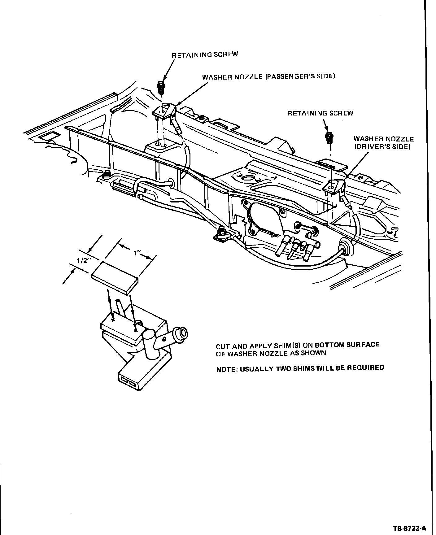 Windshield washer nozzles that spray too low on the windshield can be corrected by installing tape shims under the washer nozzles using the following procedure.
