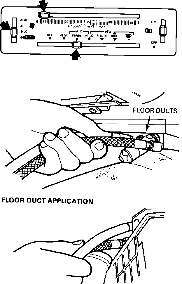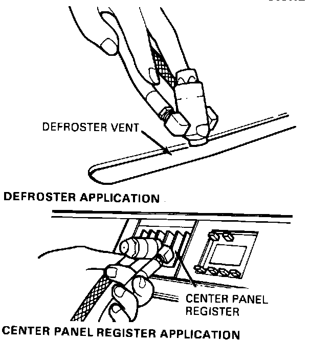13. Set the AlC system at the lowest blower speed, panel airflow to (PANEL A/C), and the temperature control set at the coolest temperature (typically 65~F). Spray mold inhibitor into each defroster, panel register, and floor duct opening for 1 to 5 seconds each.